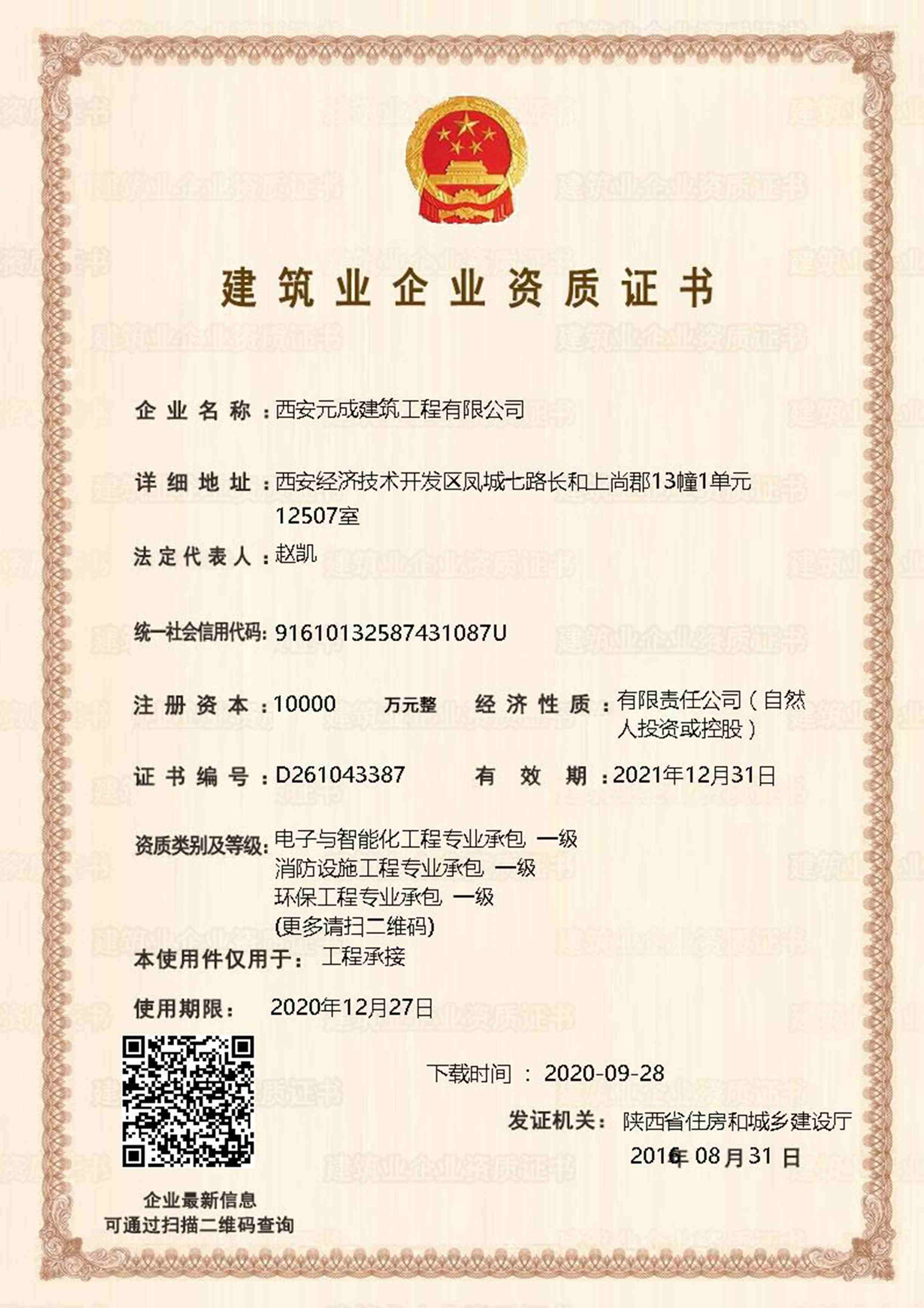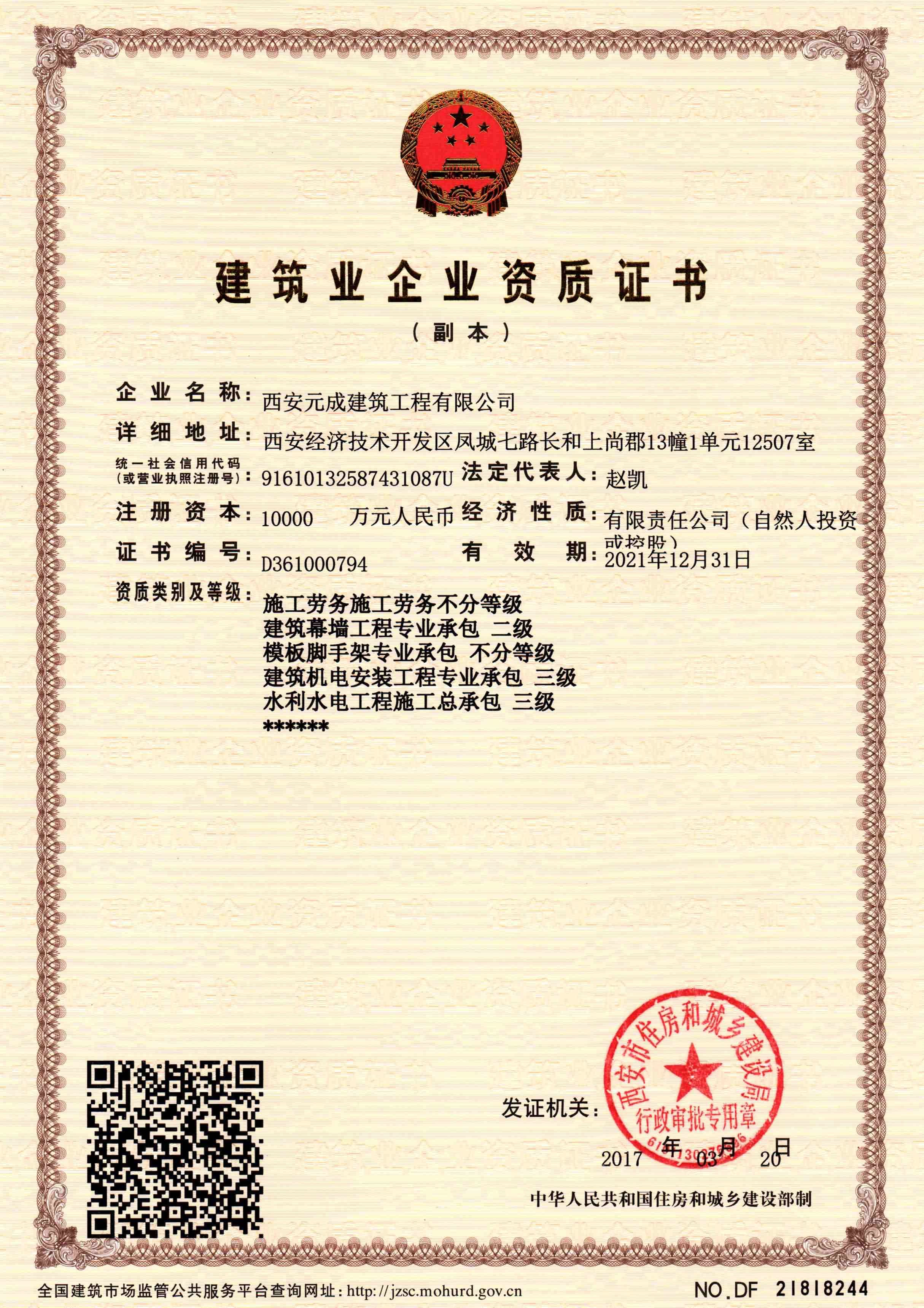 西安元成建筑工程有限公司成立于2012年,是一家擁有建筑工程、市政公用工程、石油化工工程、機(jī)電工程施工總承包貳級(jí);鋼結(jié)構(gòu)工程、防水防腐保溫工程專(zhuān)業(yè)承包貳級(jí);電力工程、水利水電工程施工總承包叁級(jí);建筑機(jī)電安裝工程、輸變電工程、環(huán)保工程專(zhuān)業(yè)承包三級(jí);模板腳手架專(zhuān)業(yè)承包、勞務(wù)分包等綜合性施工企業(yè)。